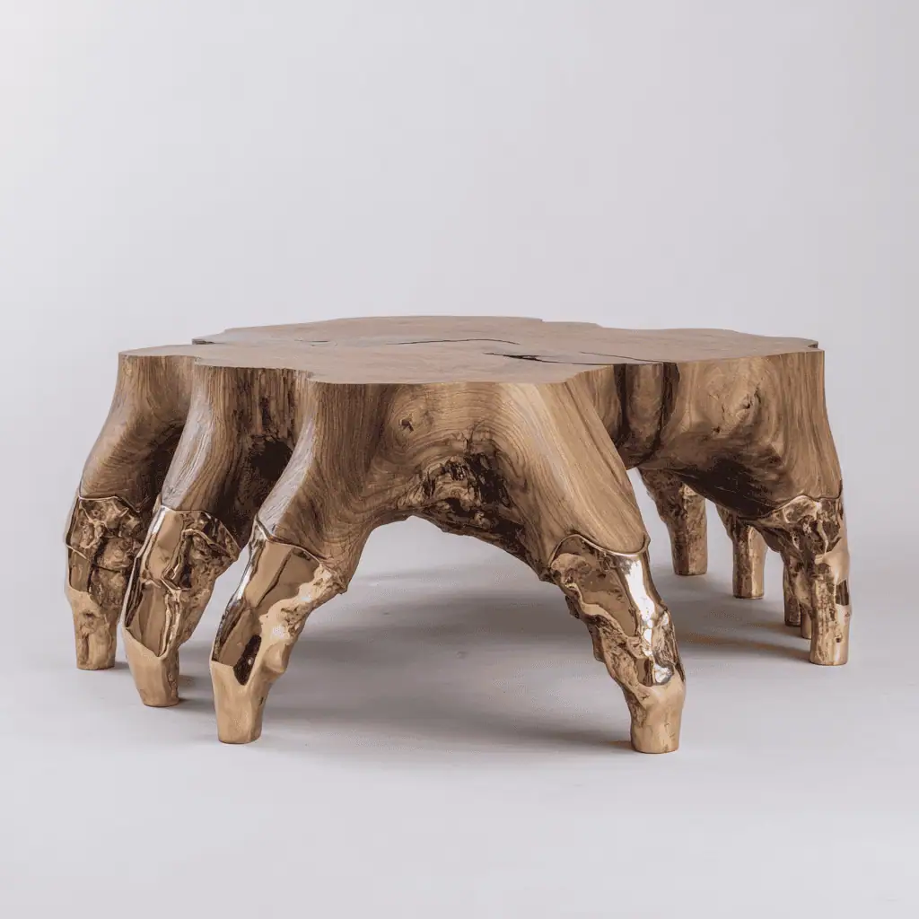 ROOTED COFFEE TABLE is a living remnant of time where wood and metal intertwine like memory and myth. It speaks of ancient forests and molten earth, a union of organic pulse and elemental fire. Each polished root glows like the last breath of daylight through soil, grounding the space in quiet power and reverent transformation.